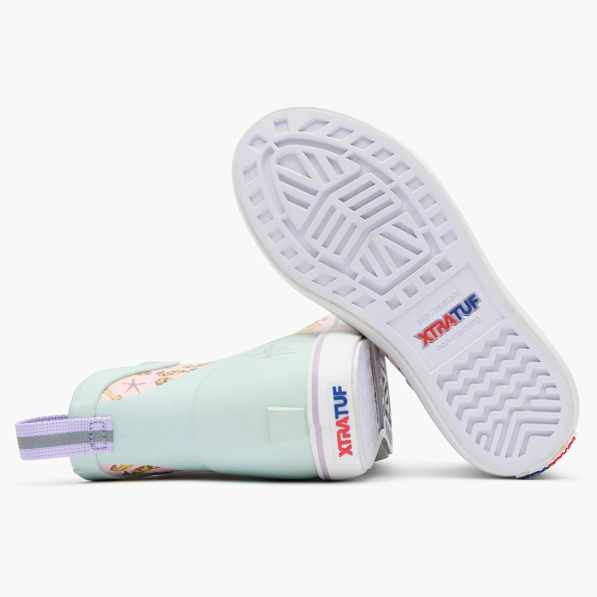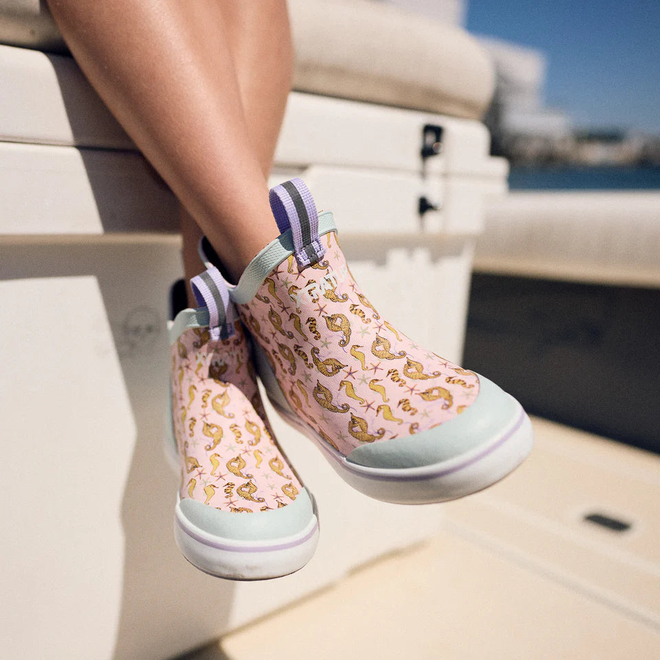 The Ankle Deck Boot is one of XTRATUF's most iconic silhouettes due to its versatile design and Alaska proven performance. Now available in popular kids sizes for the toughest youth out there. The Kids ADB is the first slip resistant, non-marking rubber boot on the market designed specifically for young anglers. This style features Guy Harvey's original Seahorse print.